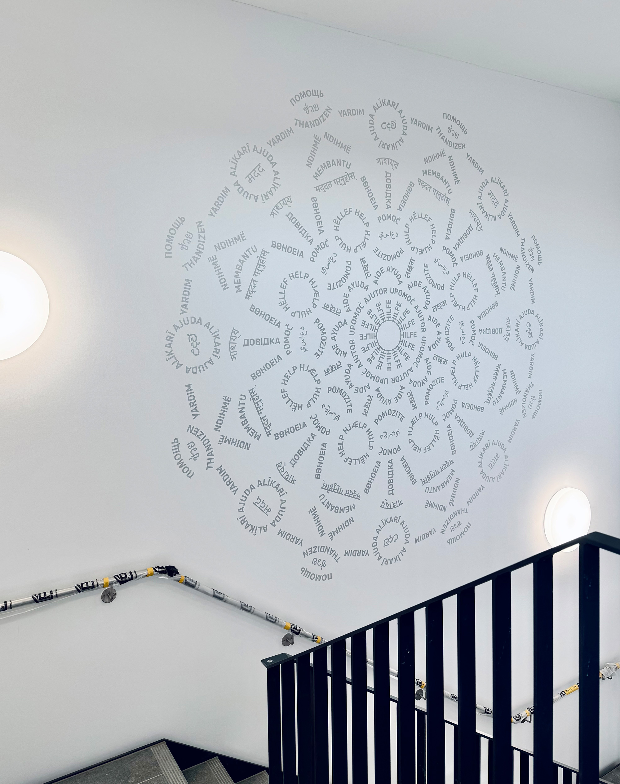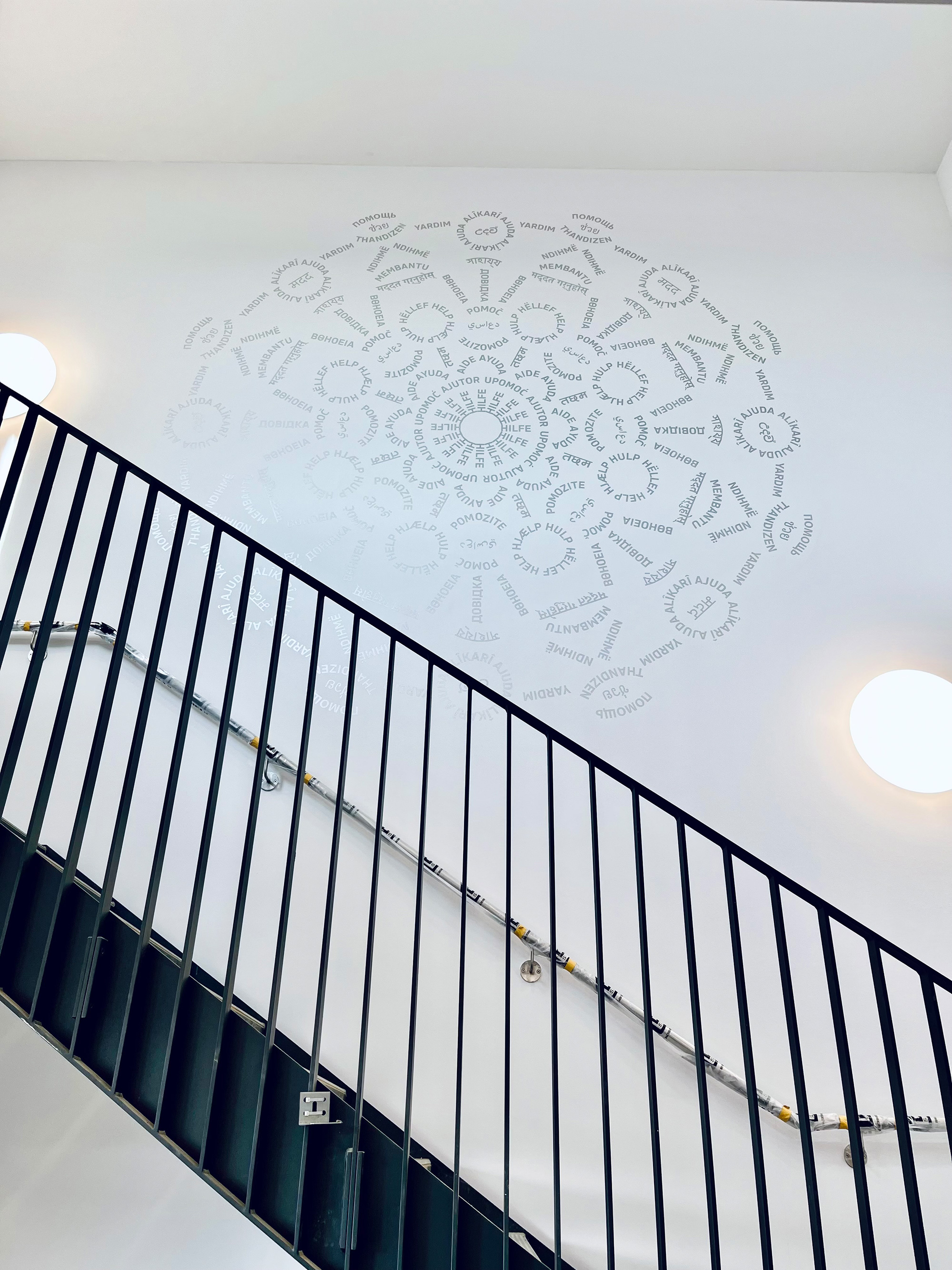 HILFE steht im Zentrum des Kreisornaments aus Worten, das sich auf der Stirnwand des Treppenhauses entfaltet. Übersetzt in über 30 Sprachen, die in den rund 50 Ländern gesprochen werden, in denen das THW seit 1953 Hilfe geleistet hat, vervielfältigt sich der Begriff von innen nach außen. Im Ergebnis erinnert seine Form an die Fensterrose eines mittelalterlichen Münsters.