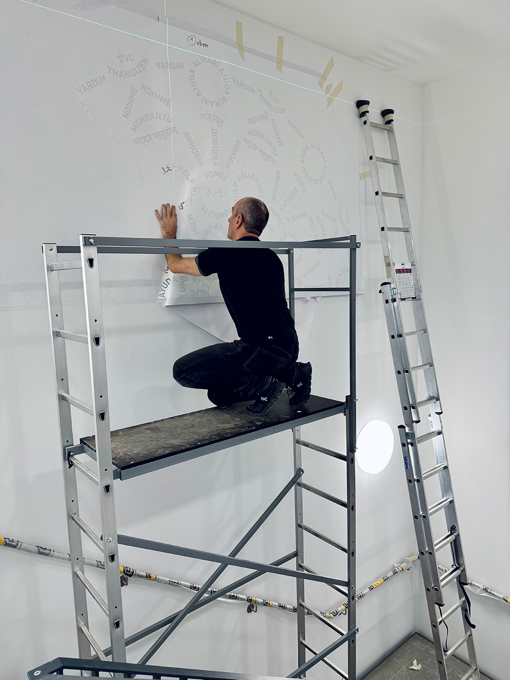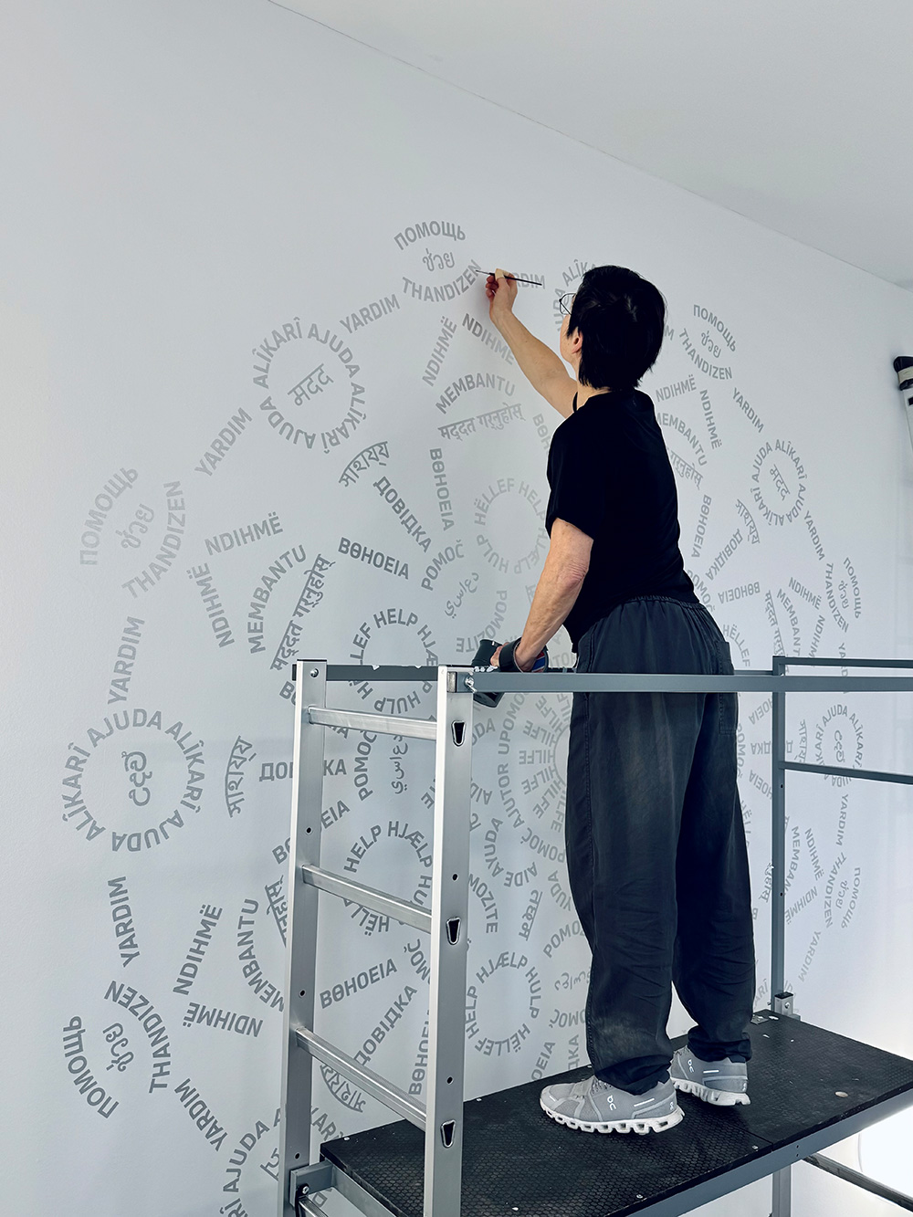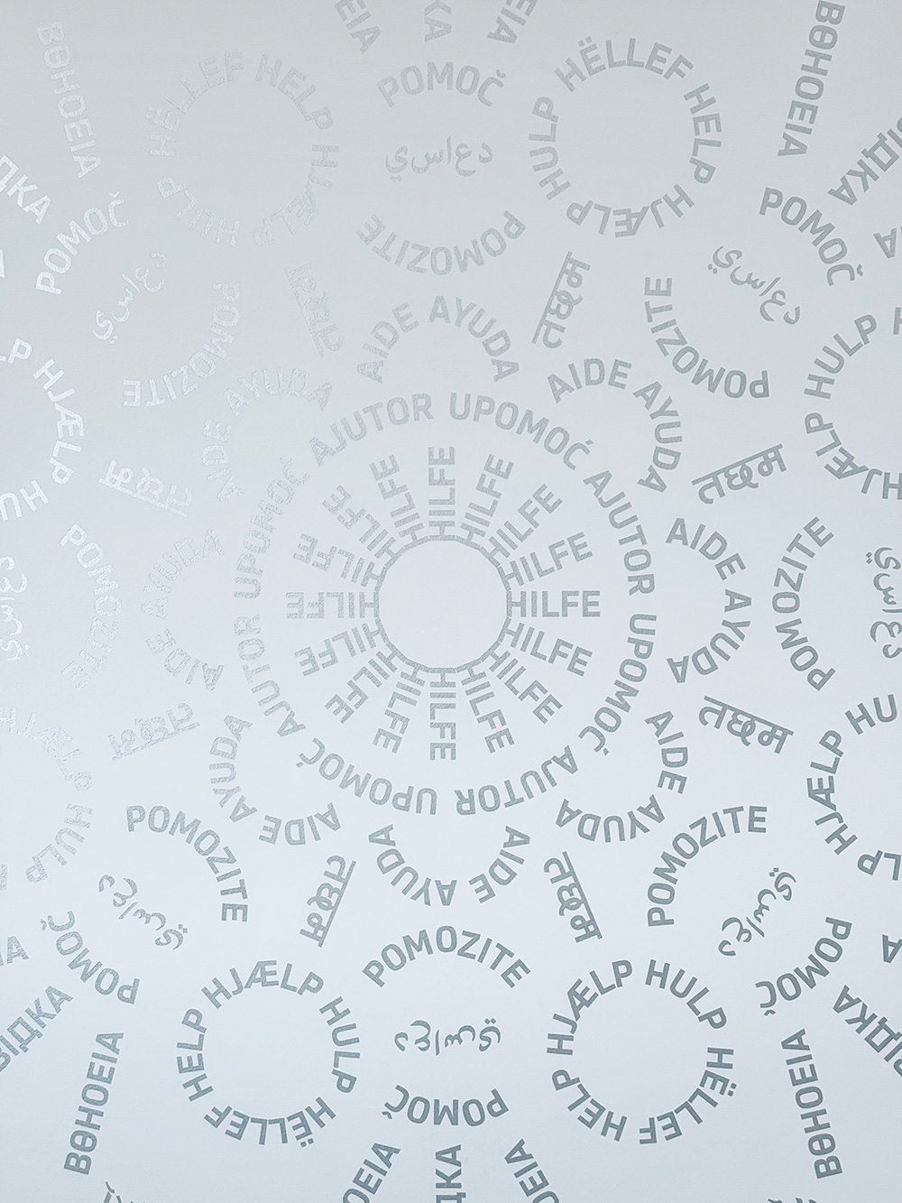 HILFE steht im Zentrum des Kreisornaments aus Worten, das sich auf der Stirnwand des Treppenhauses entfaltet. Übersetzt in über 30 Sprachen, die in den rund 50 Ländern gesprochen werden, in denen das THW seit 1953 Hilfe geleistet hat, vervielfältigt sich der Begriff von innen nach außen. Im Ergebnis erinnert seine Form an die Fensterrose eines mittelalterlichen Münsters.