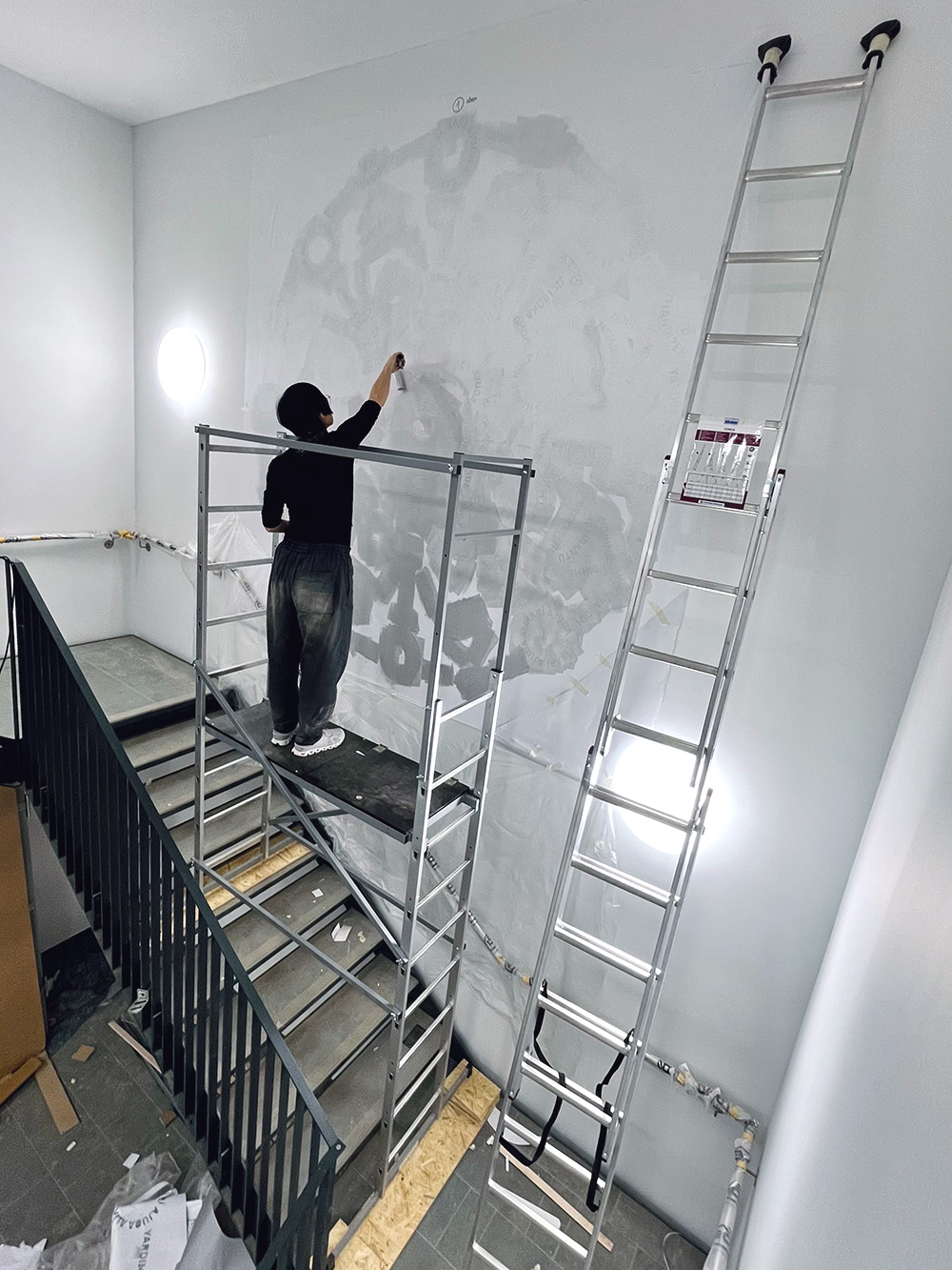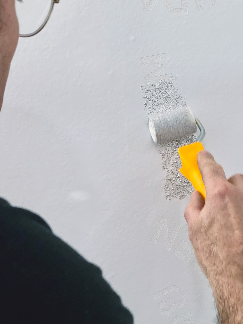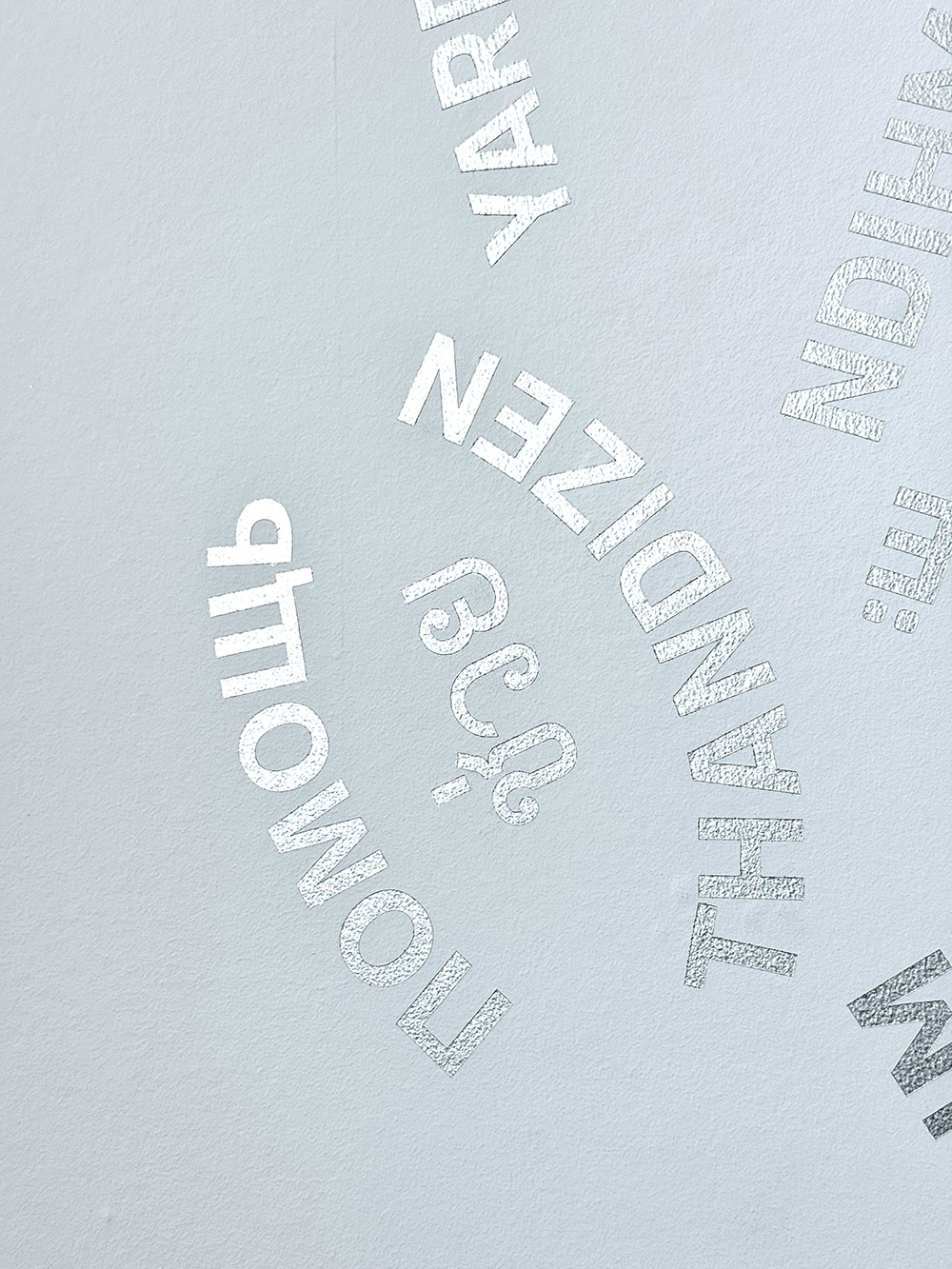 Mit einer silbernen Silikatfarbe wurden die Worte direkt auf die Wand aufgetragen. Je nach Lichteinfall, Beleuchtung und Standpunkt der Betrachtenden variiert dadurch die Wirkung. Den metallischen Farbton assoziieren wir mit Werkzeugen, die bei Einsätzen des THW zur Anwendung kommen.