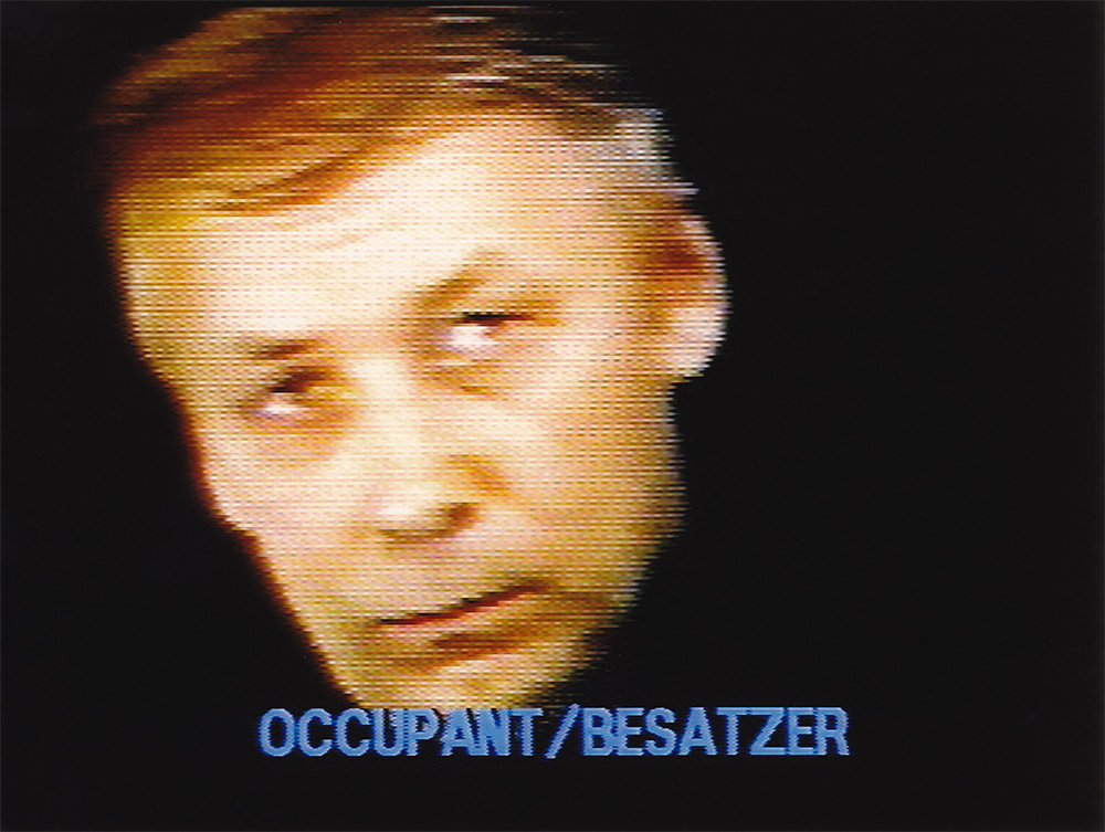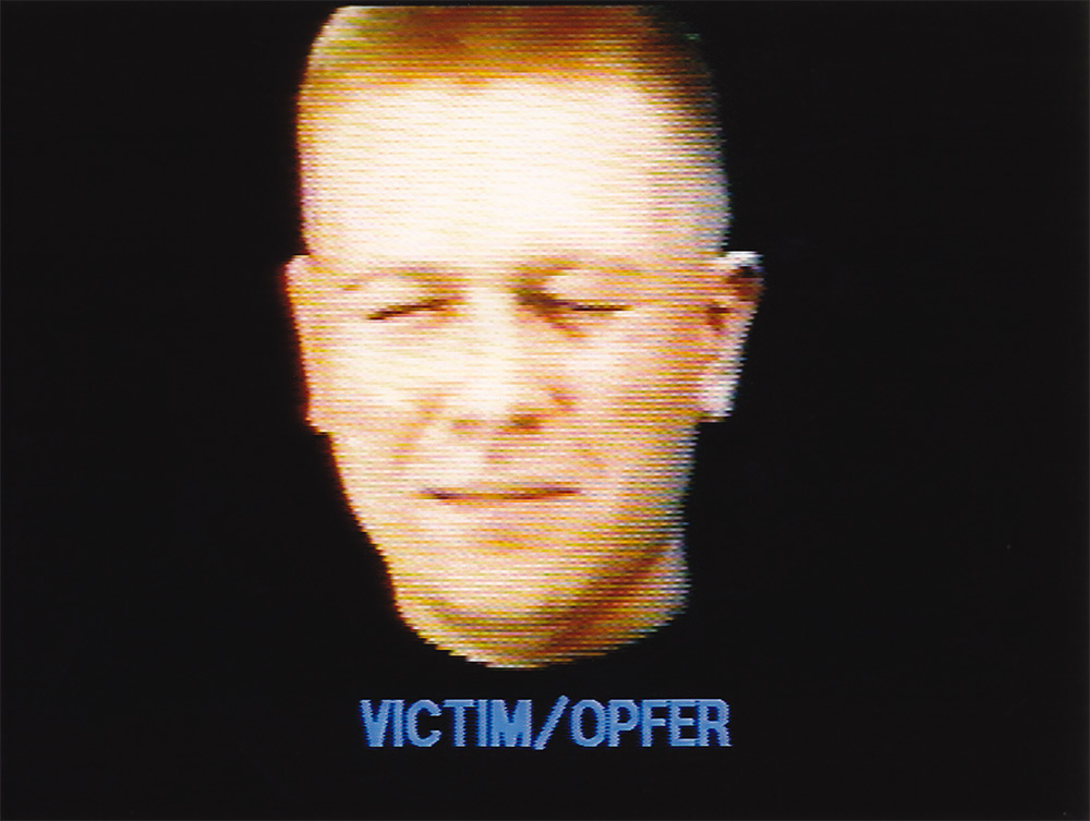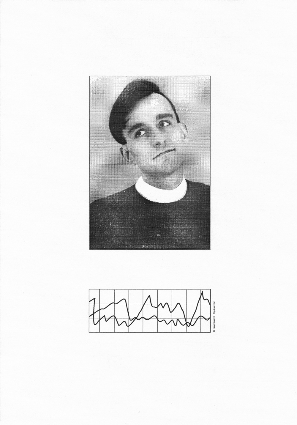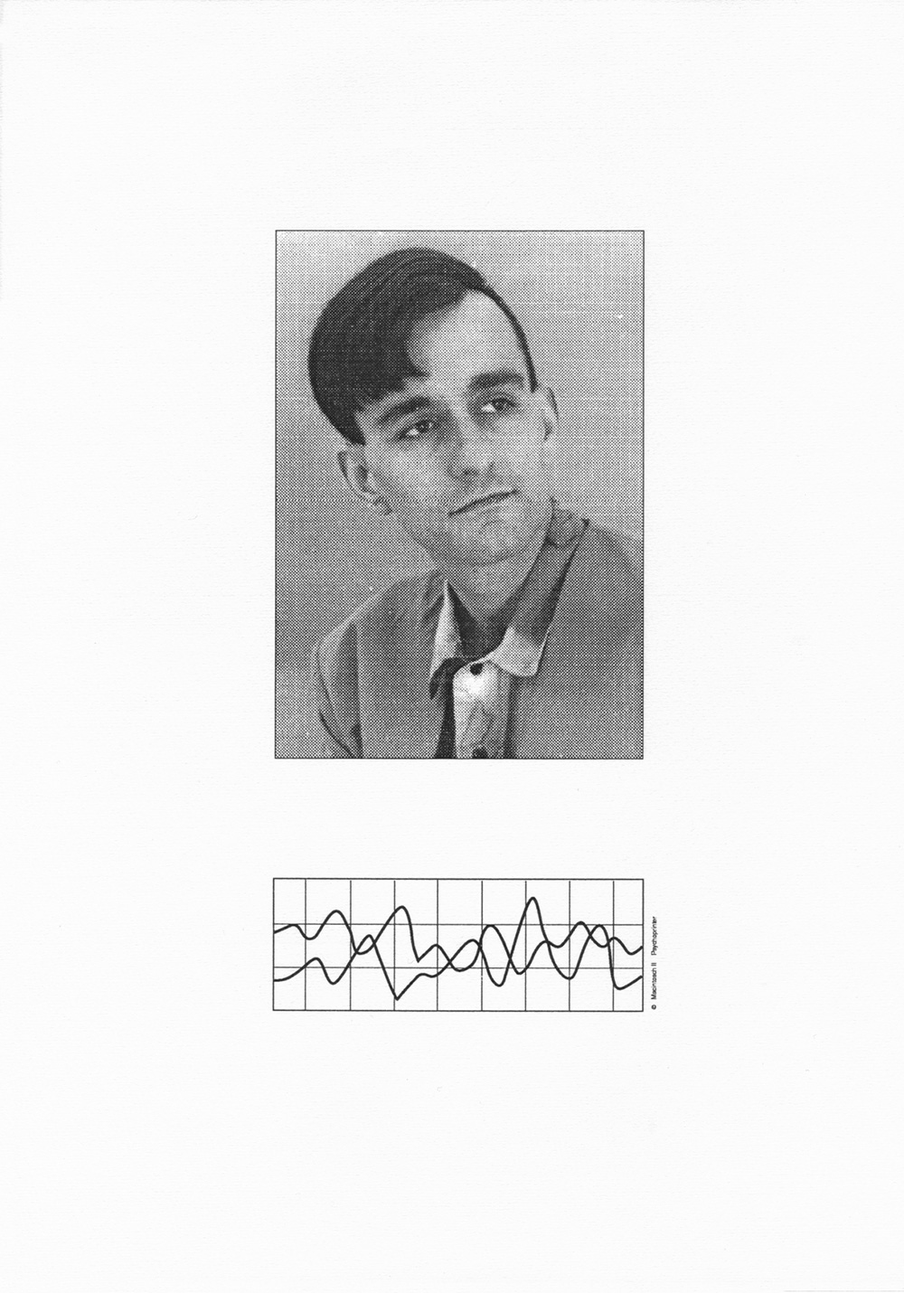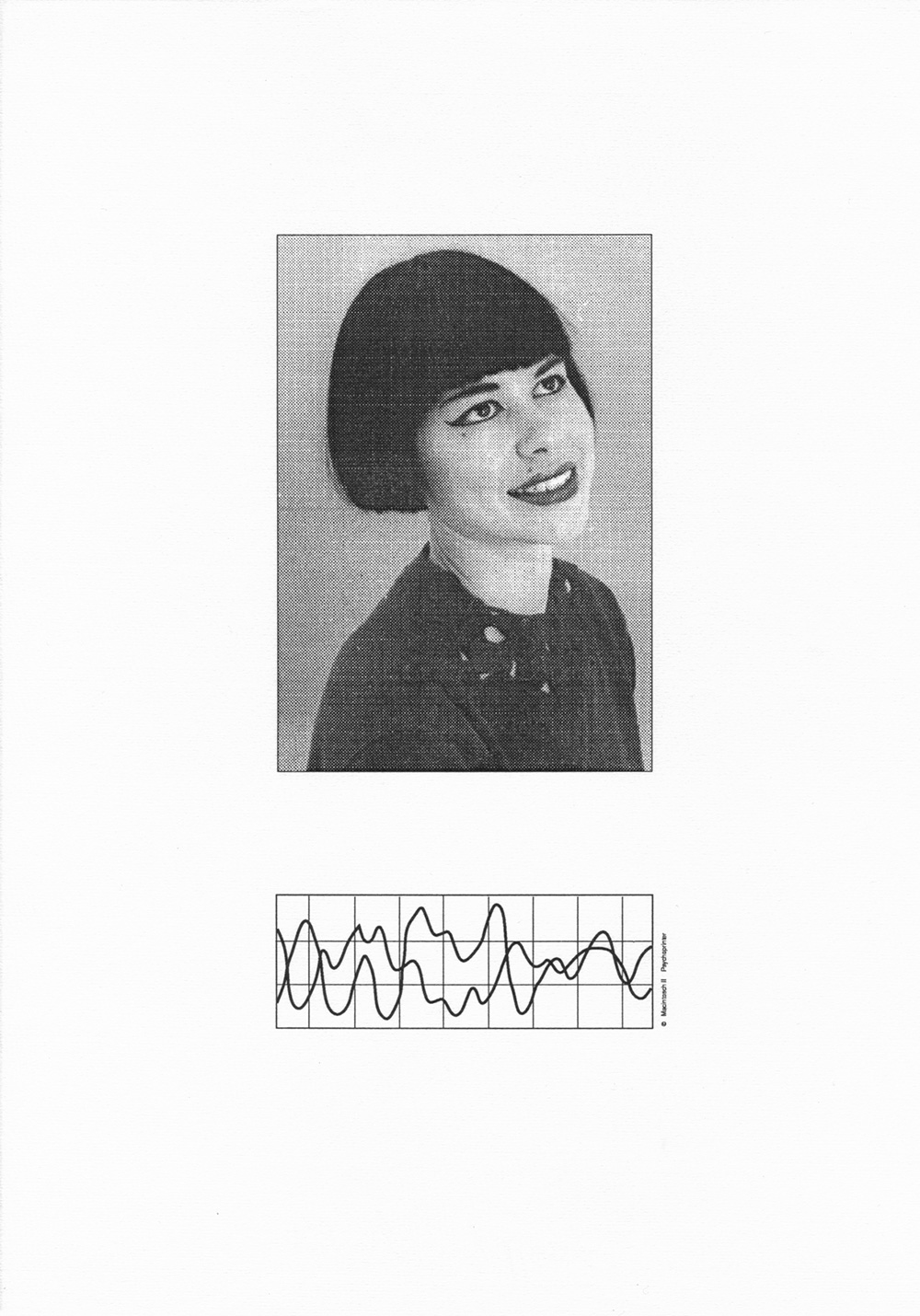 Unter den Fotos sind Kurven eines „Psychoprinters“ zu sehen, der Haltung und Ausdruck zu interpretieren scheint und die Vorstellung suggeriert, Persönlichkeit ließe sich aus fotografischen Oberflächen herauslesen.